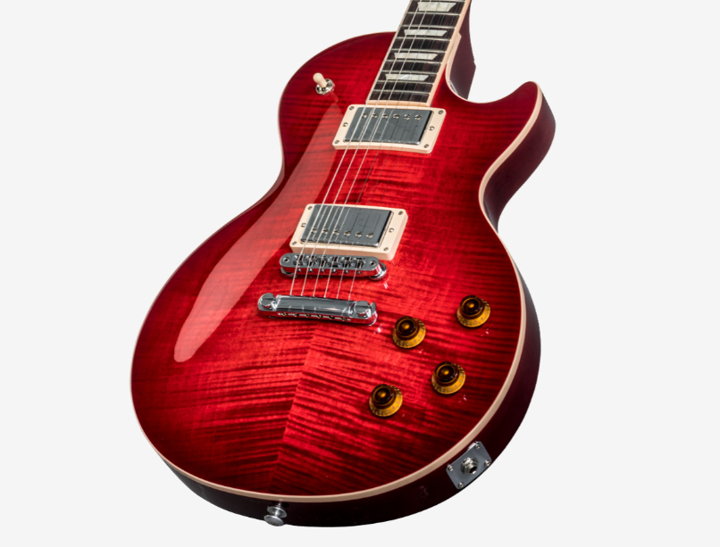木目が有名なギブソンを出来る限り表現いたしました。カラーは木目を含めたレッド系、レッドを引き立たせるためのブラック、弦を表現したガンメタルのライン、コントロールノブを表現したゴールドのプッシュロッドカバー。